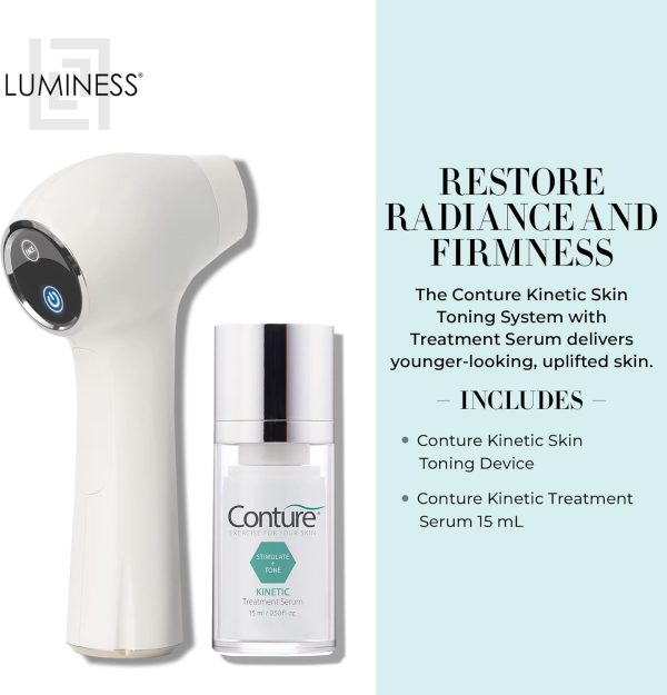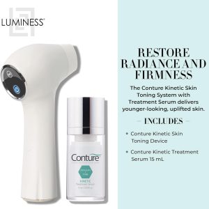 Exercise Your Skin: LUMINESS Conture Kinetic Skin Toning System with Treatment Serum is an anti-aging beauty device and serum that tones skin to restore radiance and firmness to these three main areas: décolleté, eye area, forehead. Includes: Conture Kinetic Skin Toning Device and Conture Kinetic Treatment Serum 15 mL.